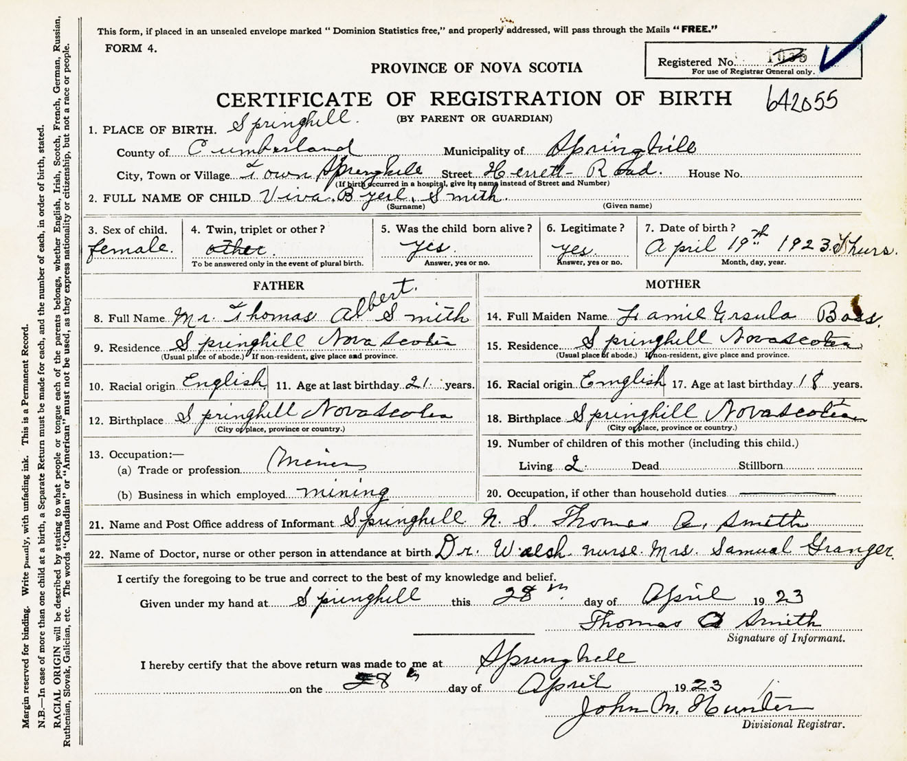 Female Birth Registration: Year: 1923 number: 64200055