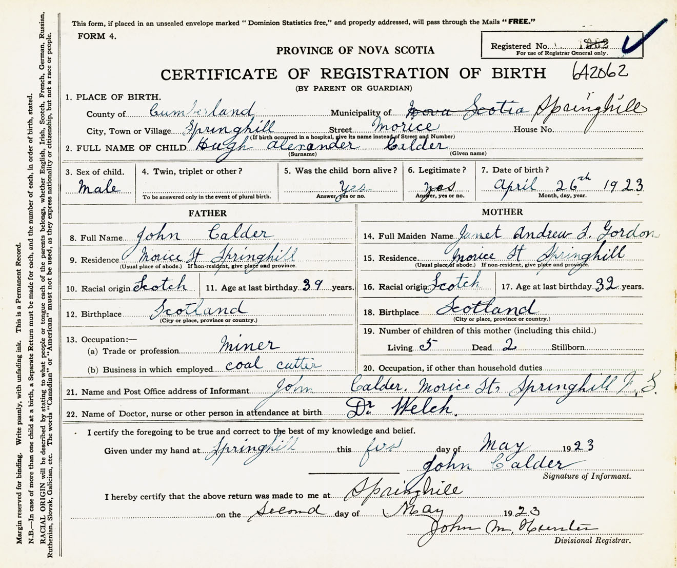 Male Birth Registration: Year: 1923 number: 64200062