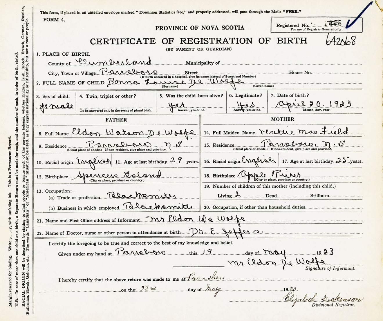 Female Birth Registration: Year: 1923 number: 64200068