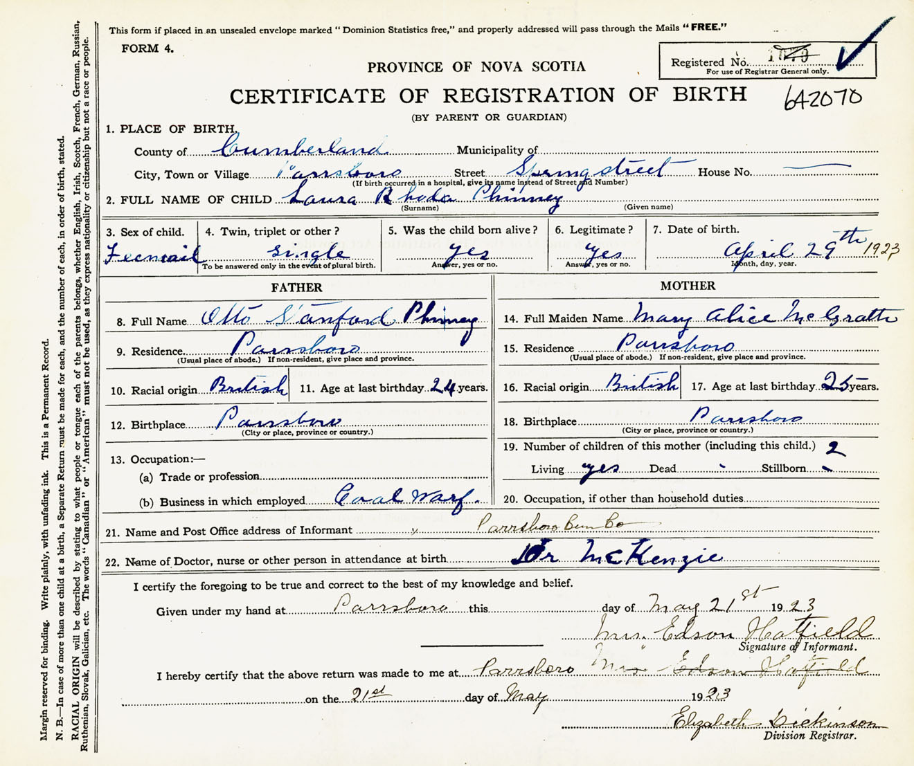 Female Birth Registration: Year: 1923 number: 64200070