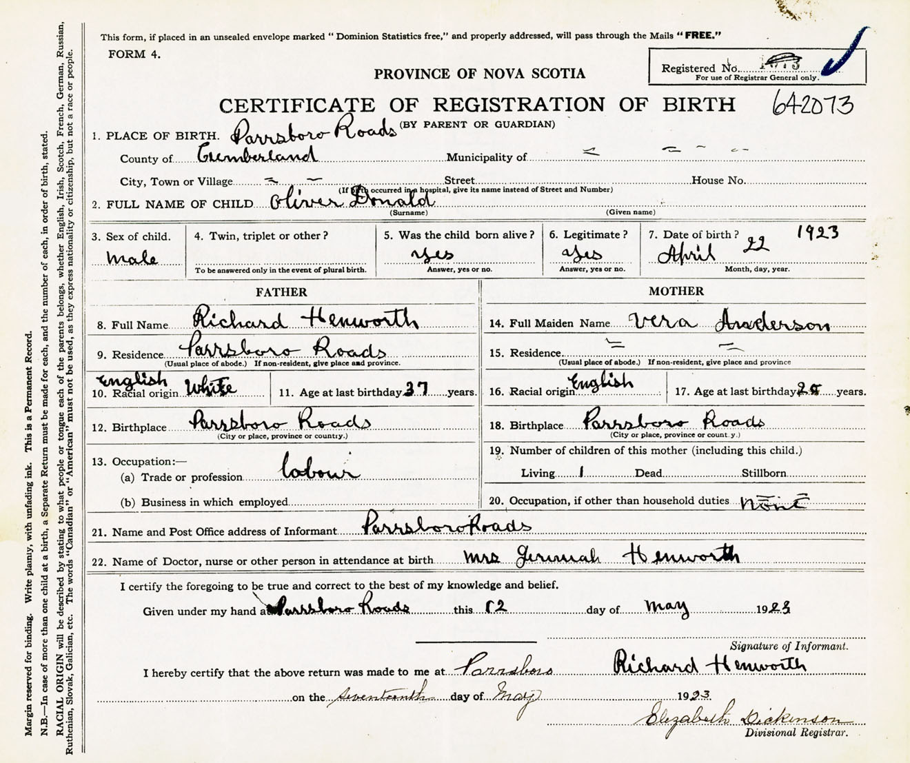 Male Birth Registration: Year: 1923 number: 64200073