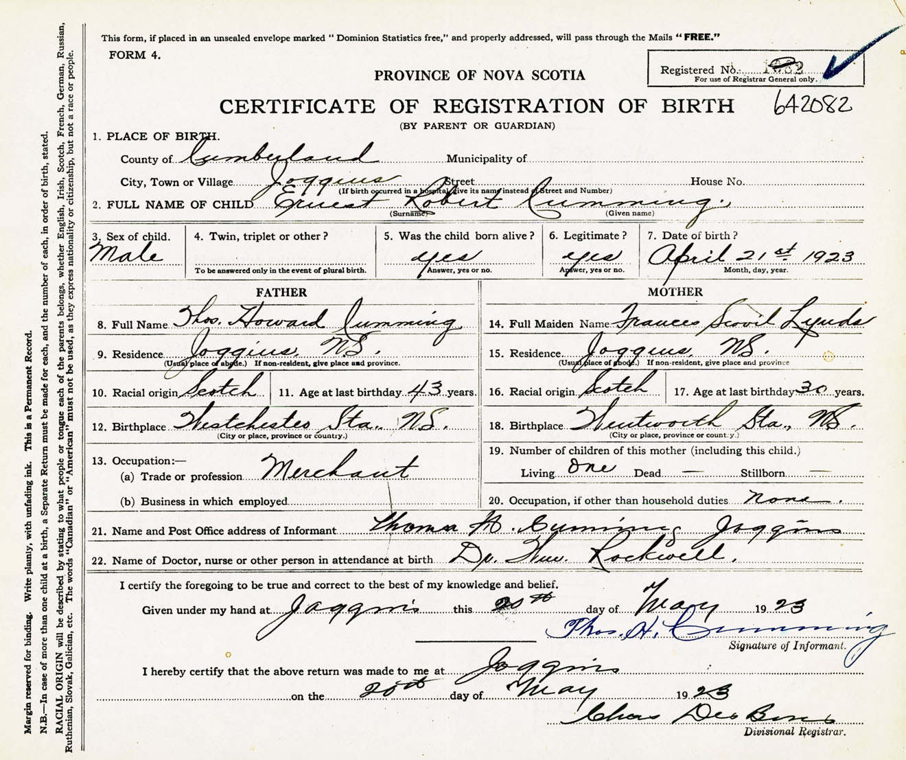 Male Birth Registration: Year: 1923 number: 64200082