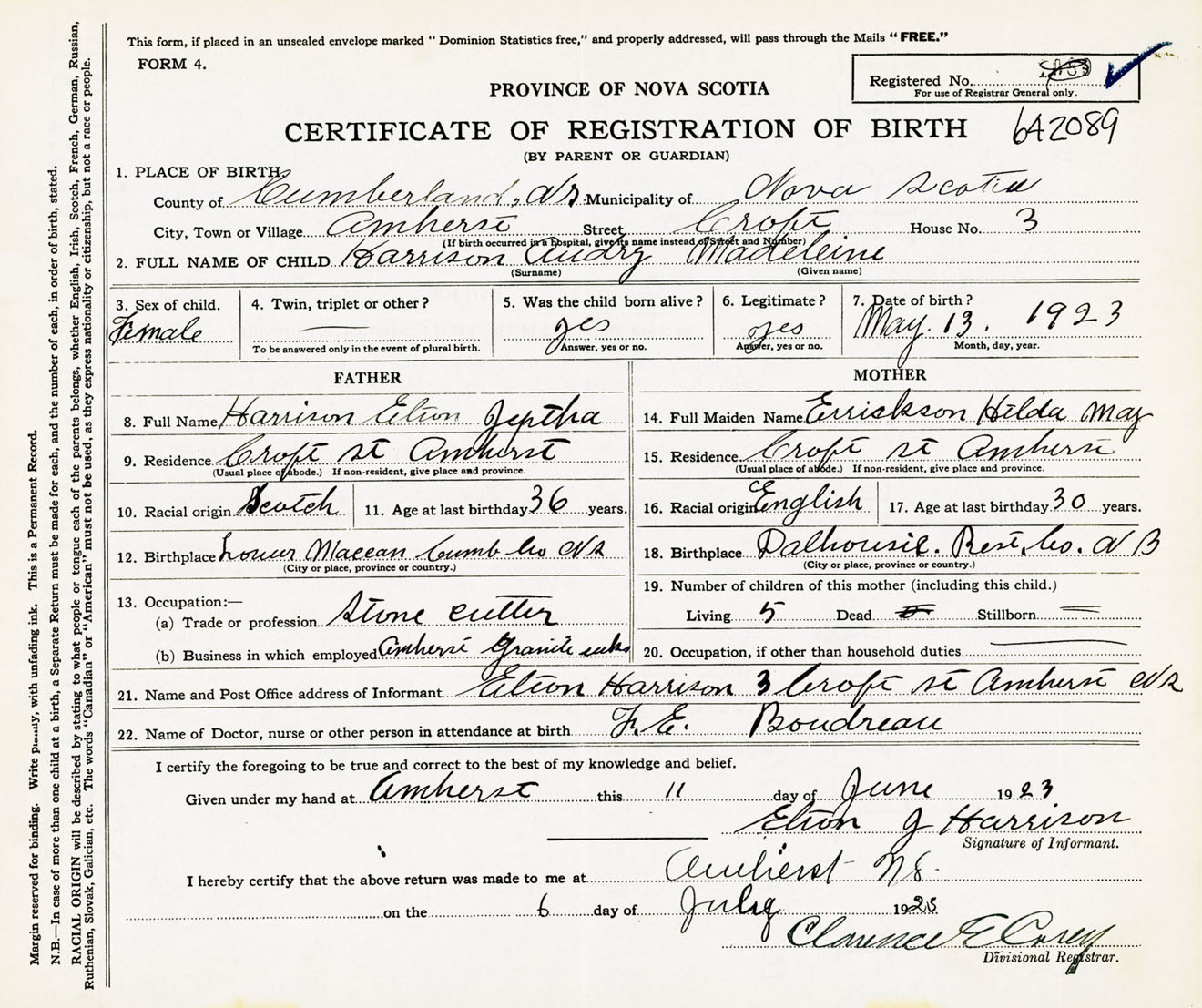 Female Birth Registration: Year: 1923 number: 64200089