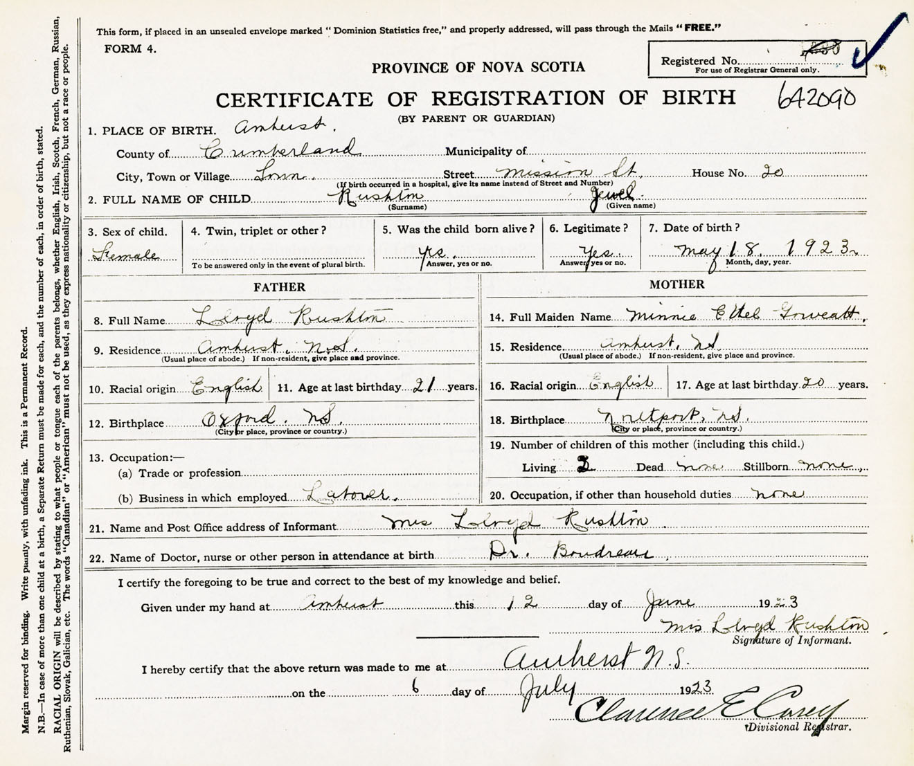 Female Birth Registration: Year: 1923 number: 64200090