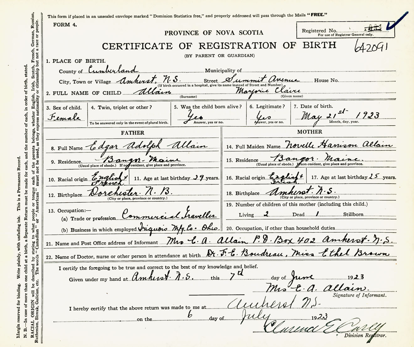 Female Birth Registration: Year: 1923 number: 64200091