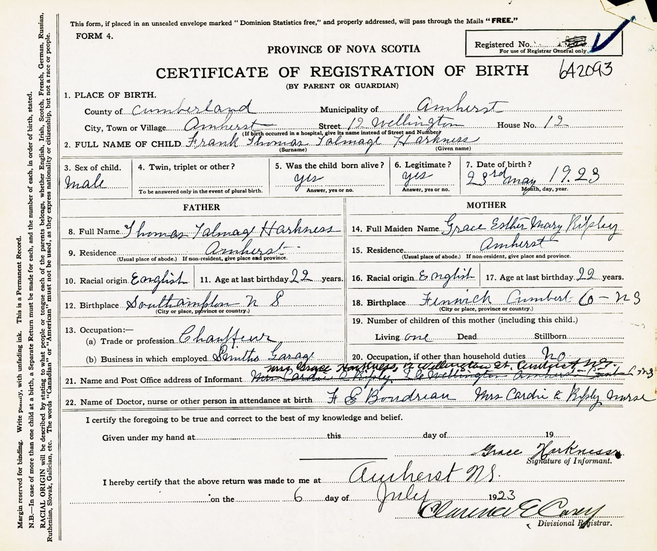 Male Birth Registration: Year: 1923 number: 64200093