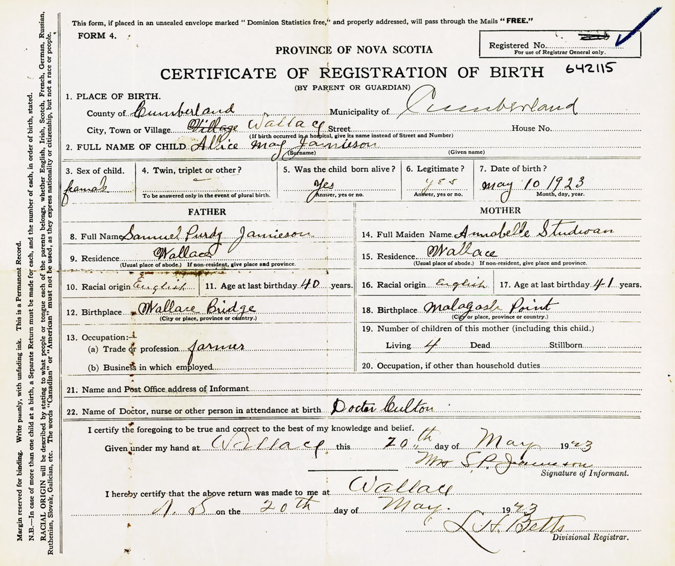 Female Birth Registration: Year: 1923 number: 64200115