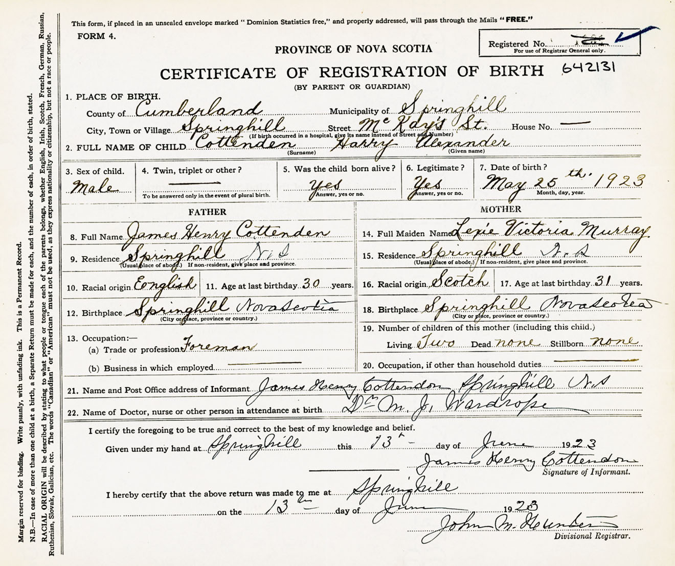 Male Birth Registration: Year: 1923 number: 64200131