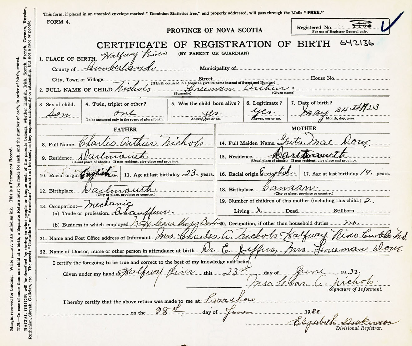 Male Birth Registration: Year: 1923 number: 64200136