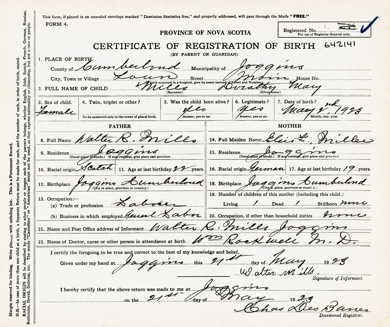 Female Birth Registration: Year: 1923 number: 64200141