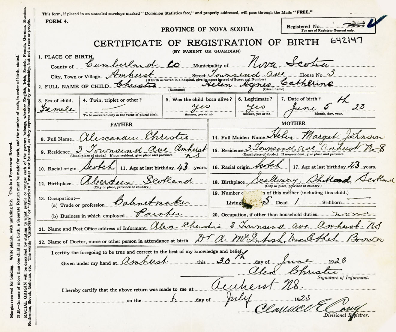 Female Birth Registration: Year: 1923 number: 64200147