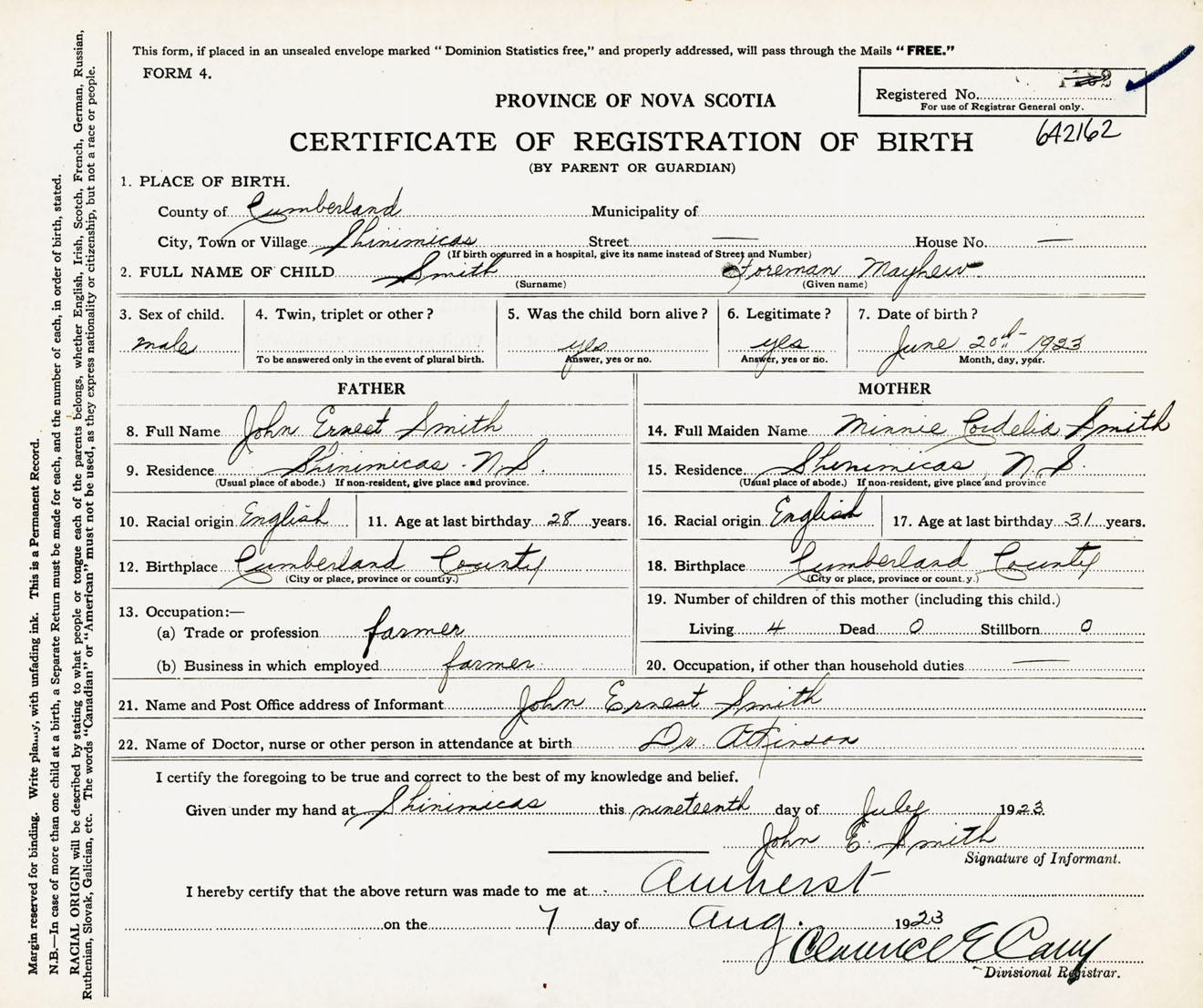 Male Birth Registration: Year: 1923 number: 64200162