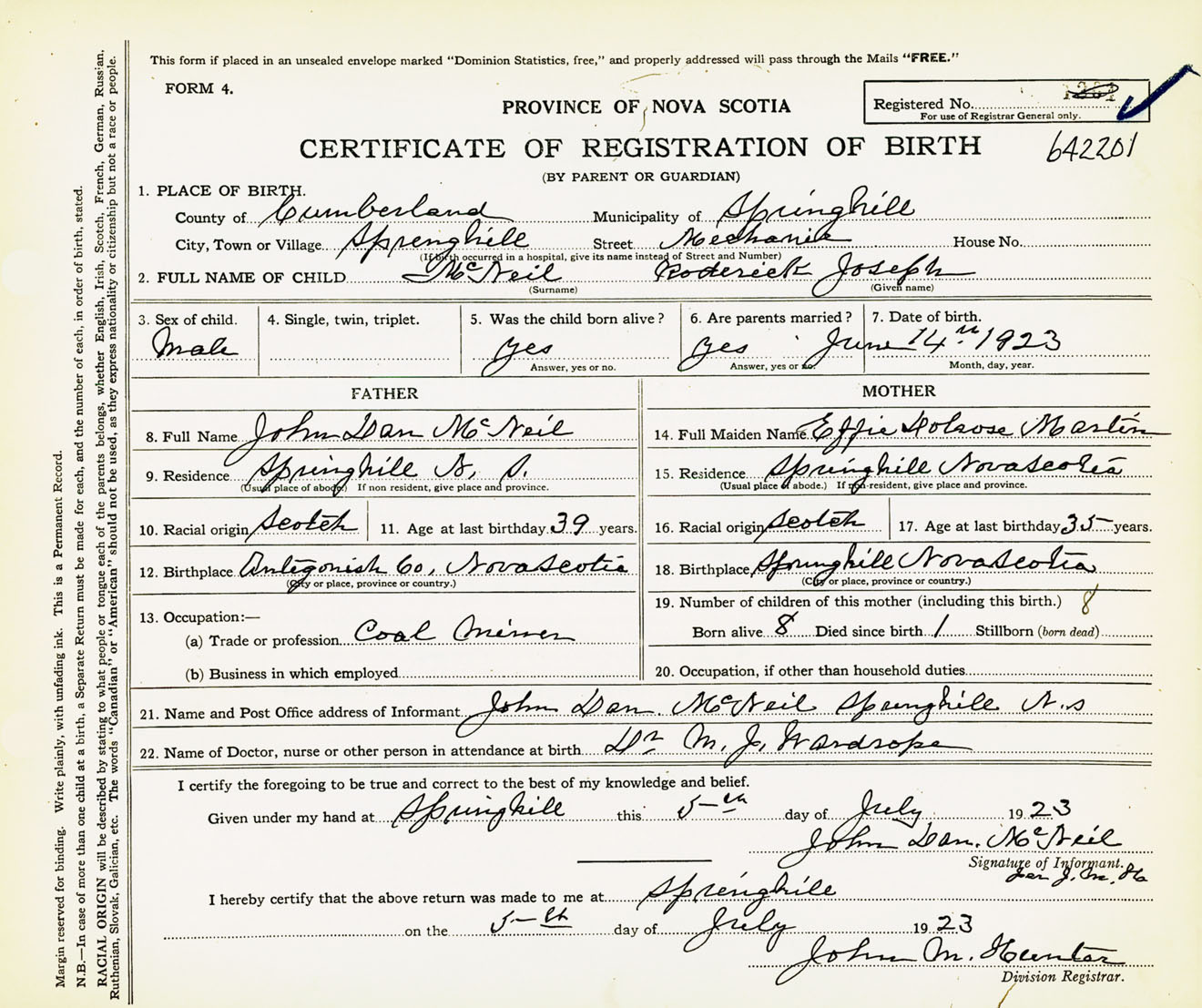 Male Birth Registration: Year: 1923 number: 64200201