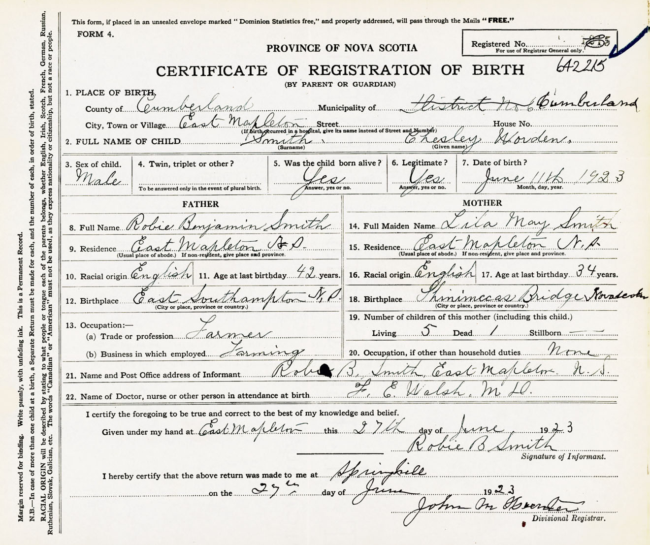 Male Birth Registration: Year: 1923 number: 64200215