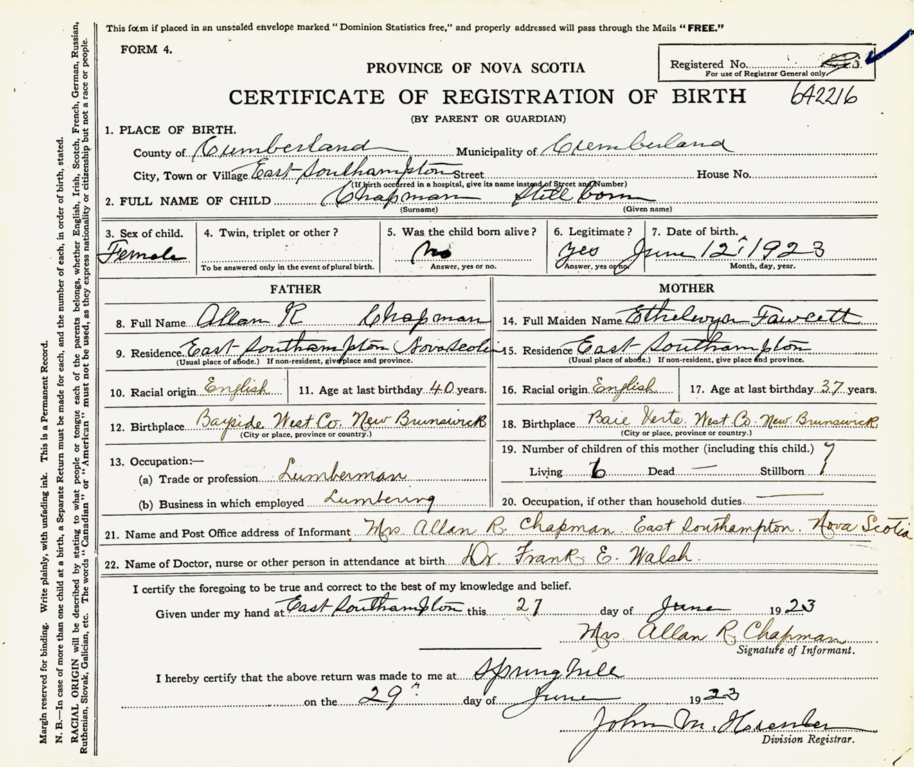 Female Birth Registration: Year: 1923 number: 64200216