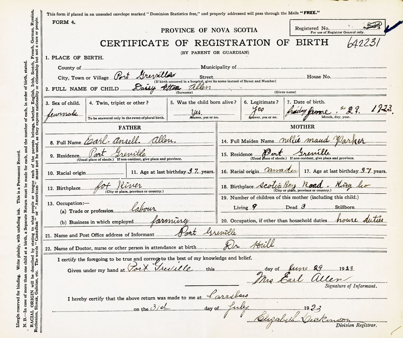 Female Birth Registration: Year: 1923 number: 64200231