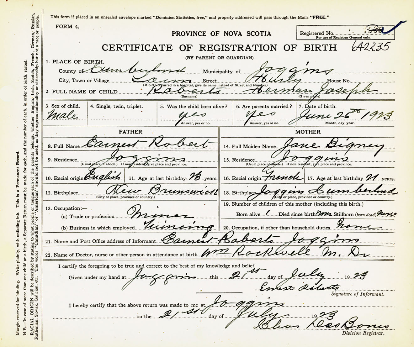 Male Birth Registration: Year: 1923 number: 64200235