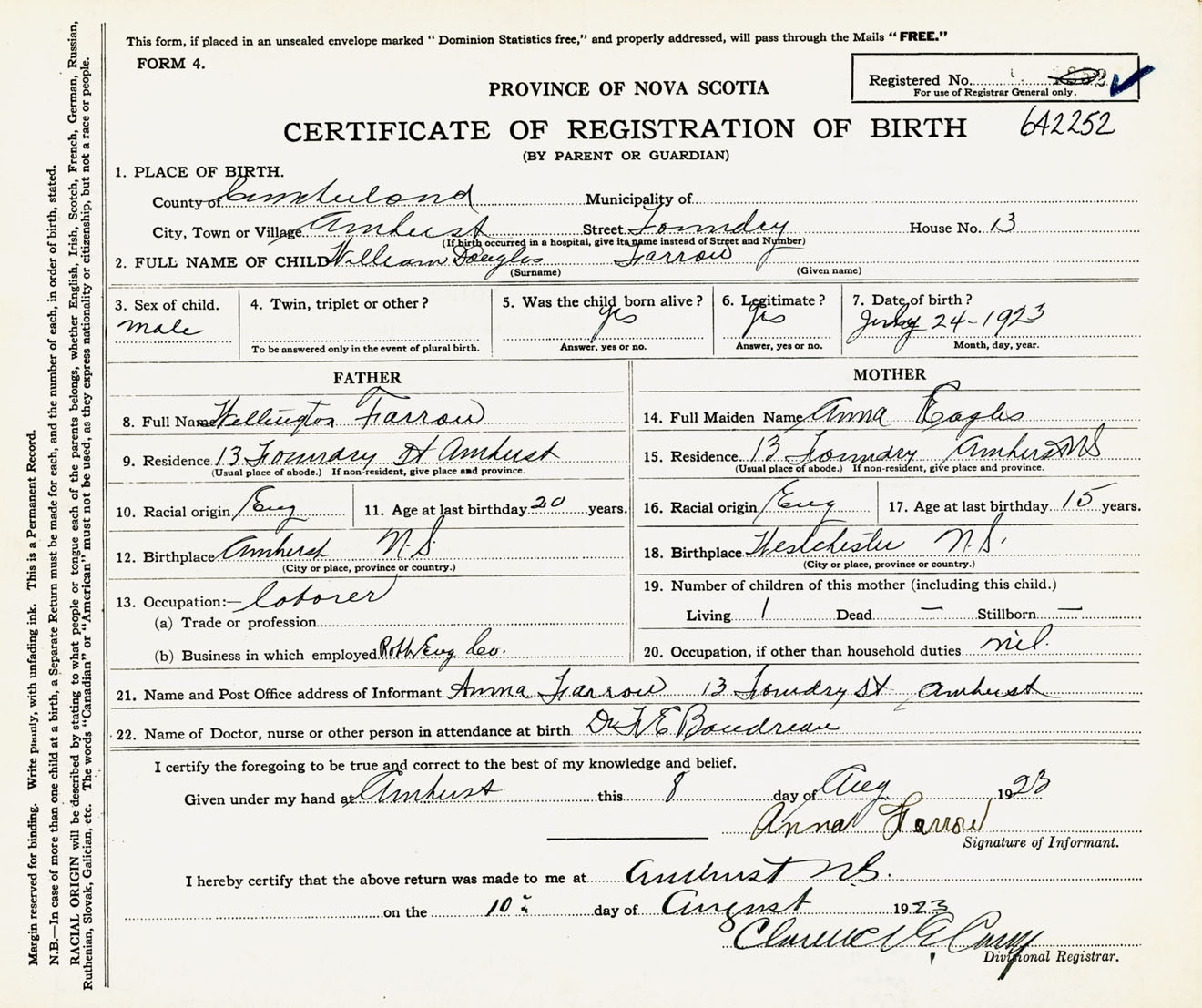 Male Birth Registration: Year: 1923 number: 64200252