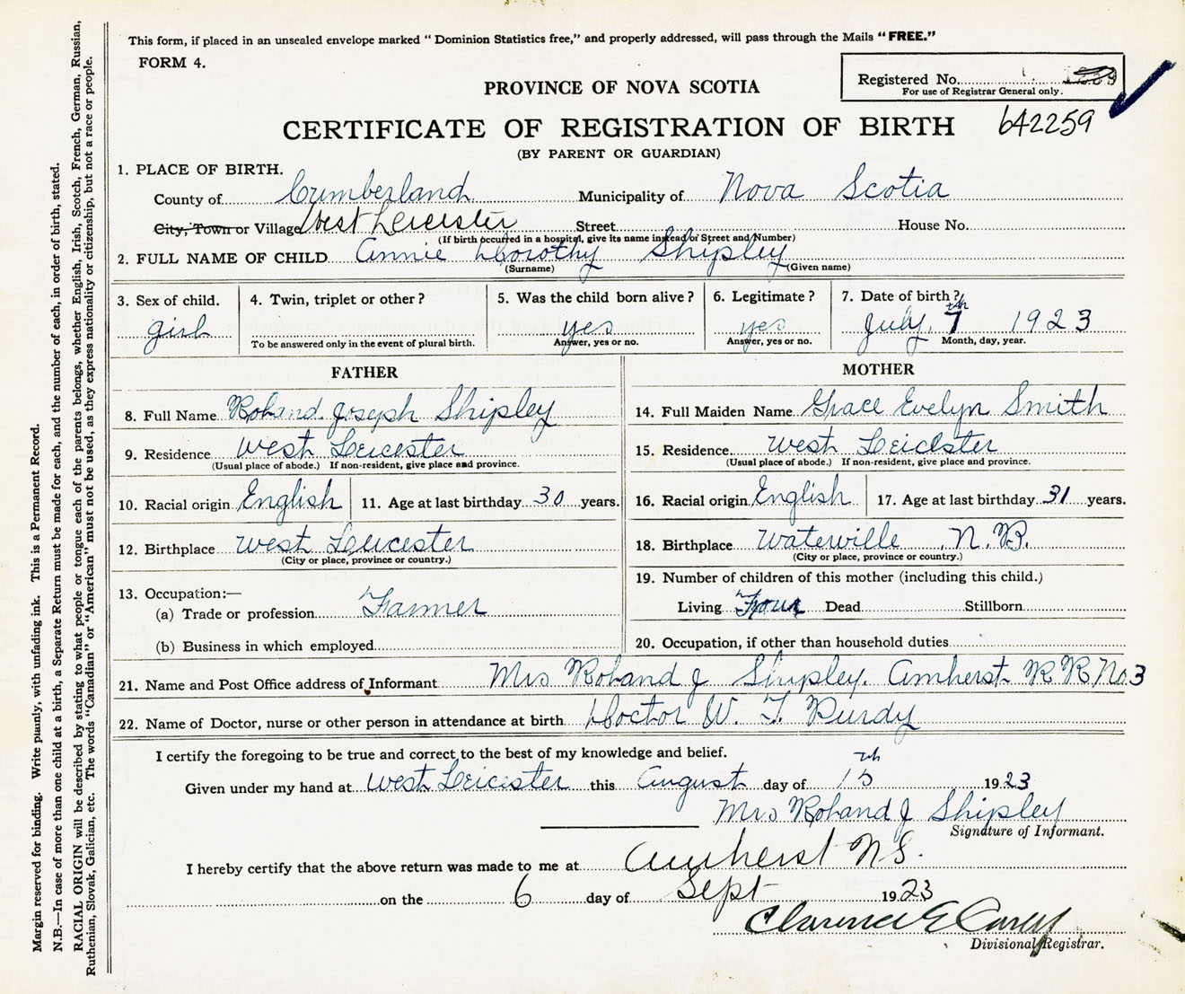 Female Birth Registration: Year: 1923 number: 64200259