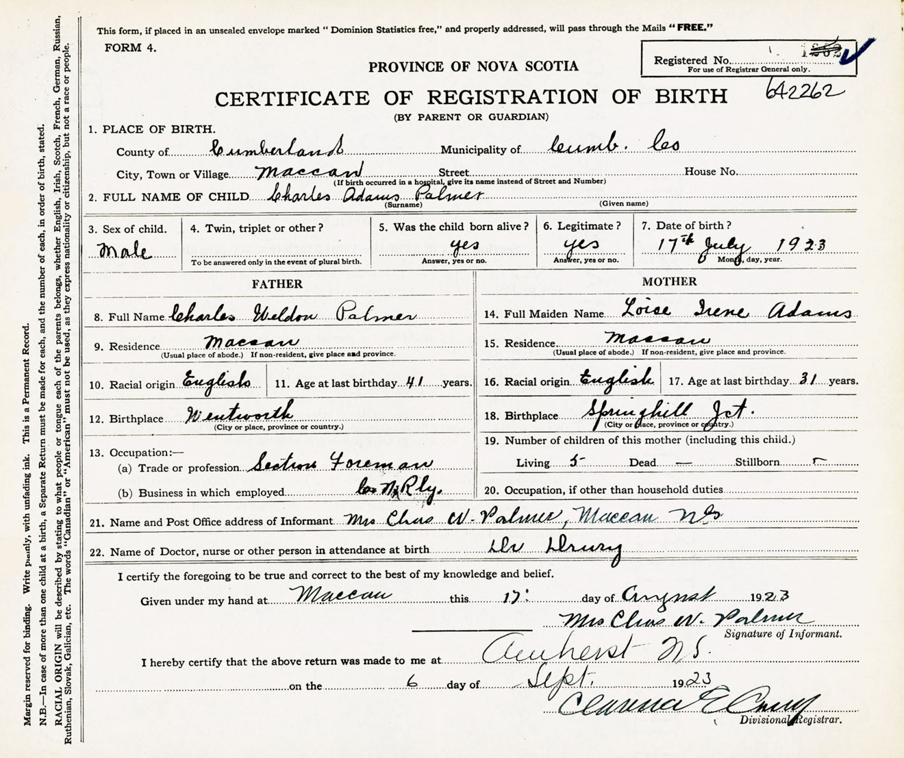Male Birth Registration: Year: 1923 number: 64200262