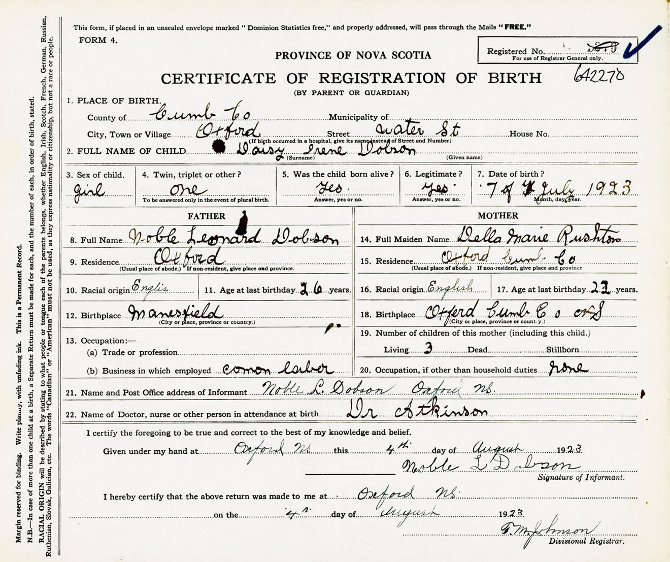 Female Birth Registration: Year: 1923 number: 64200270