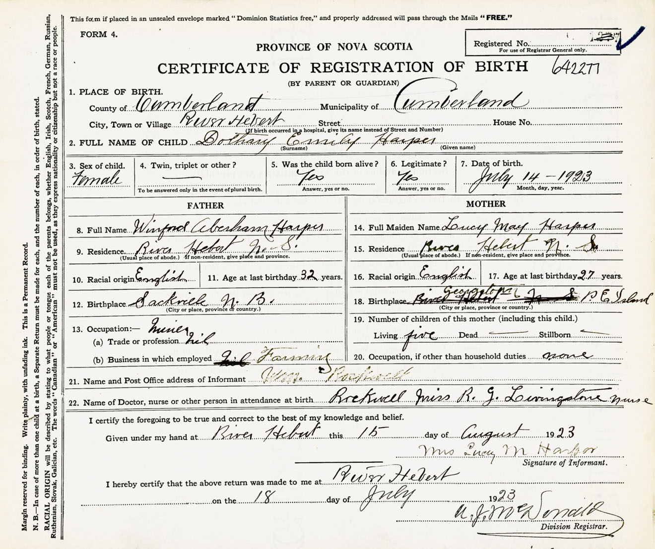 Female Birth Registration: Year: 1923 number: 64200277