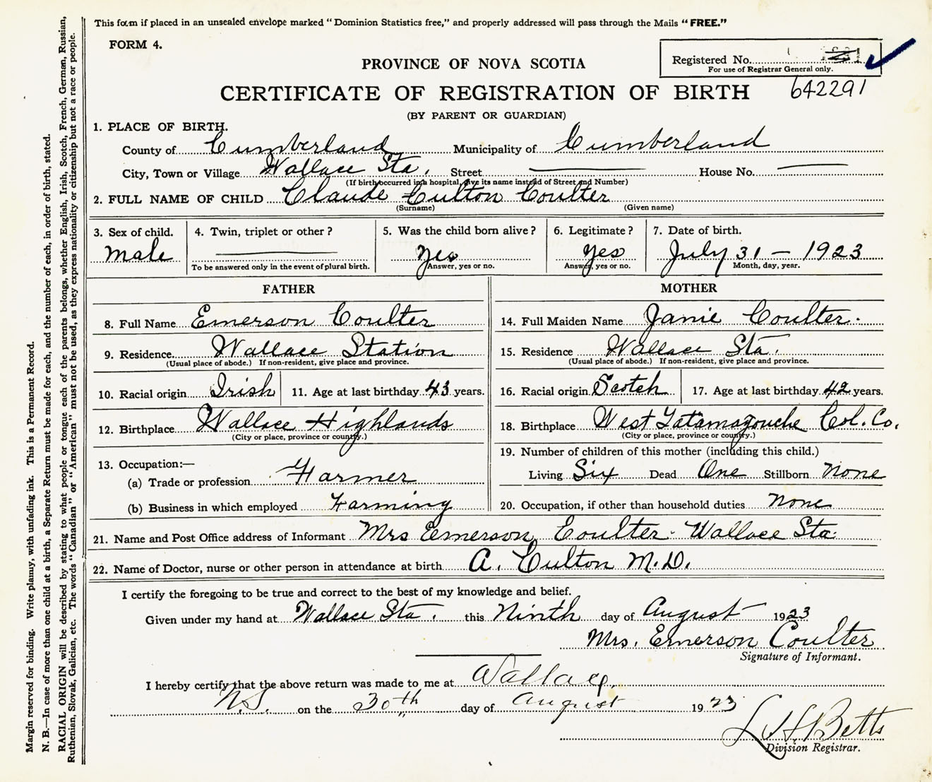 Male Birth Registration: Year: 1923 number: 64200291