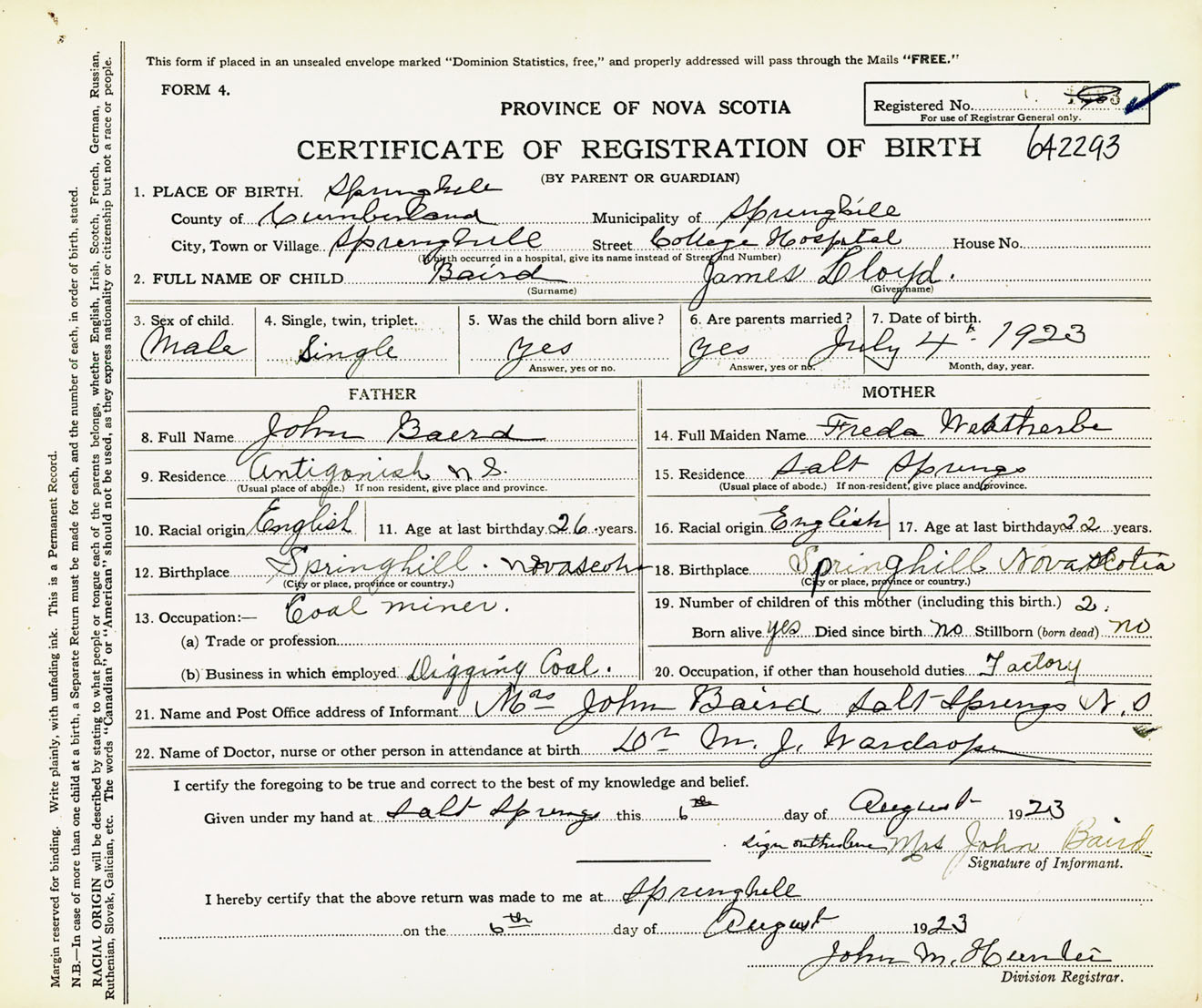 Male Birth Registration: Year: 1923 number: 64200293