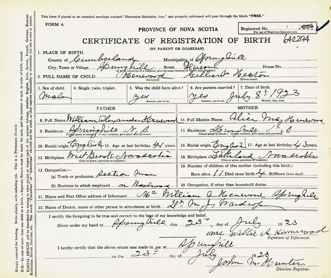 Male Birth Registration: Year: 1923 number: 64200294