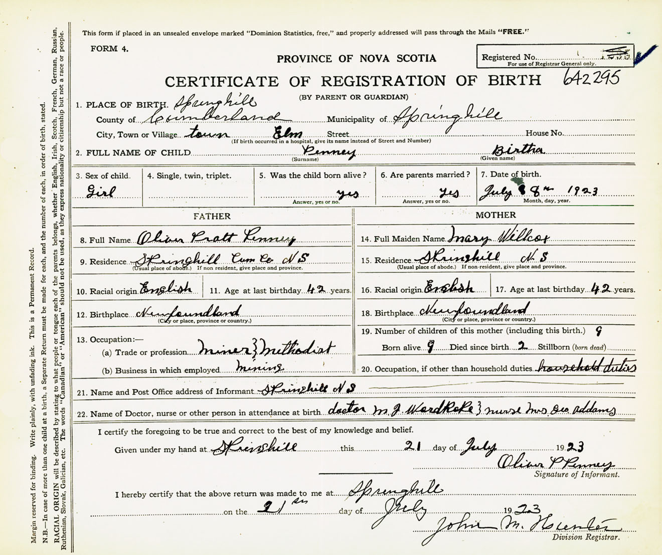 Female Birth Registration: Year: 1923 number: 64200295