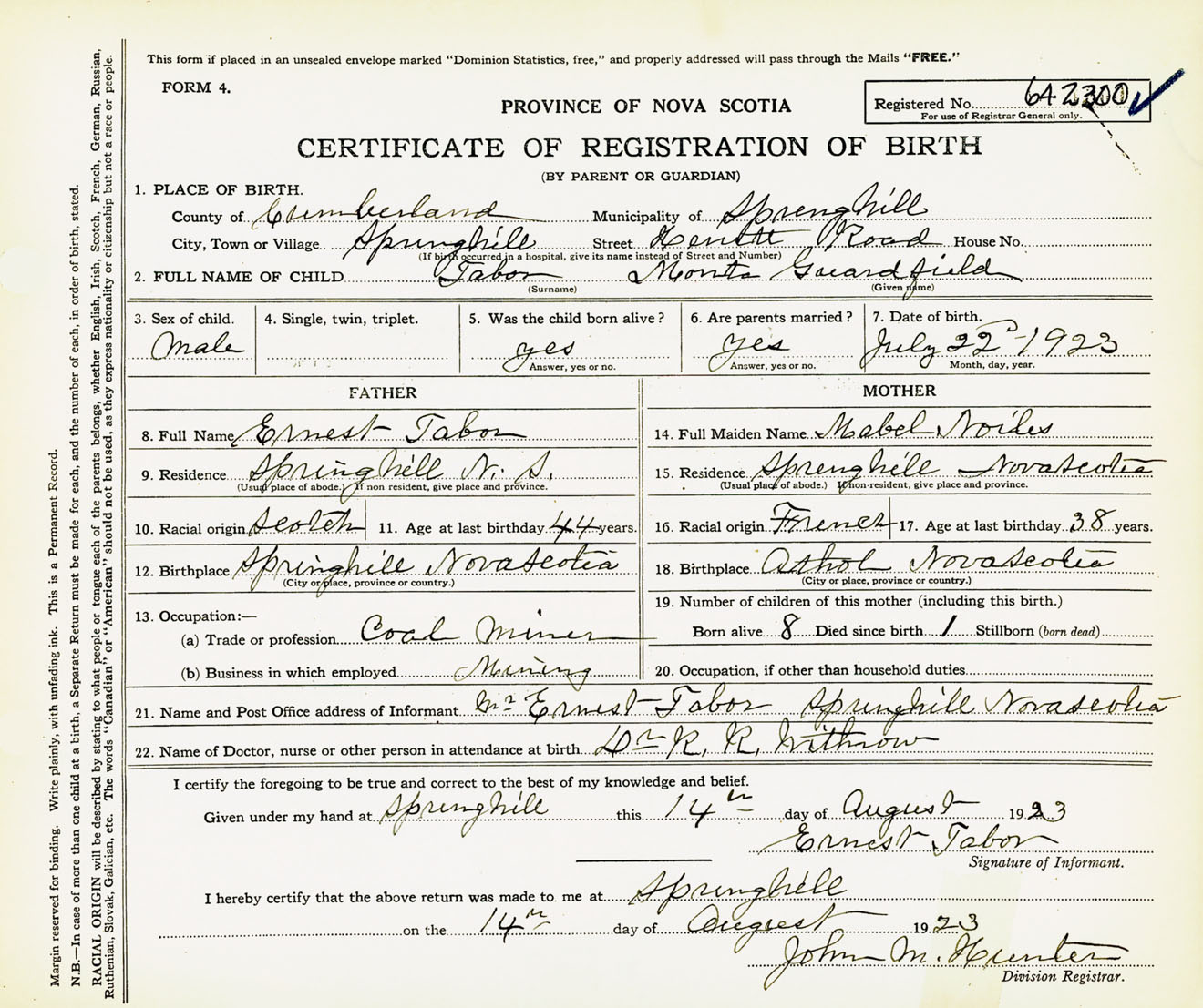 Male Birth Registration: Year: 1923 number: 64200300