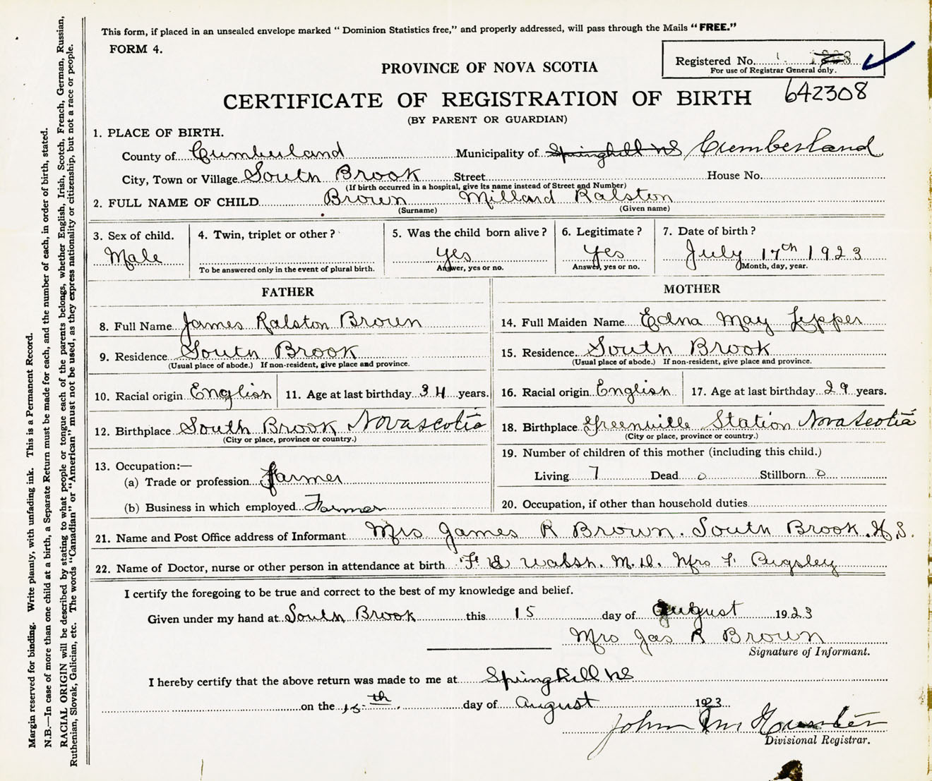 Male Birth Registration: Year: 1923 number: 64200308