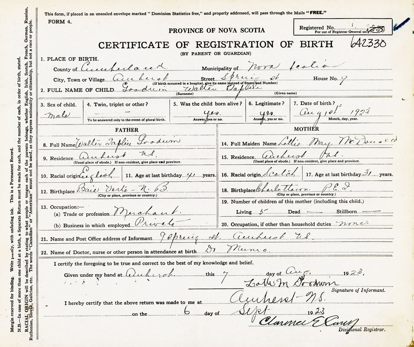 Male Birth Registration: Year: 1923 number: 64200330