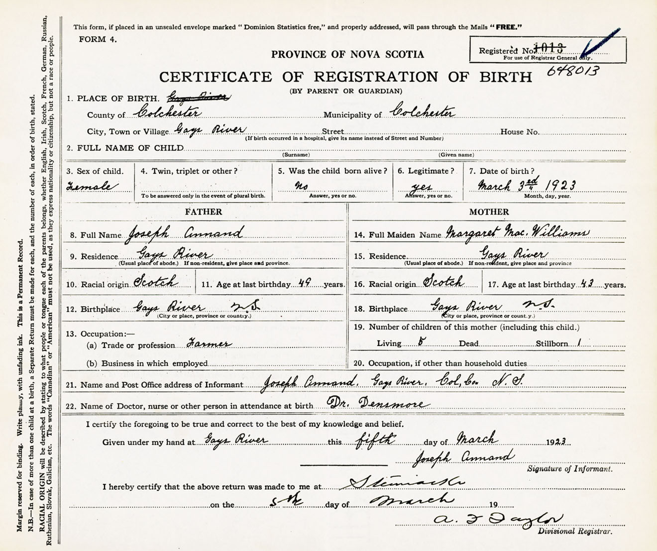 Female Birth Registration: Year: 1923 number: 64800013