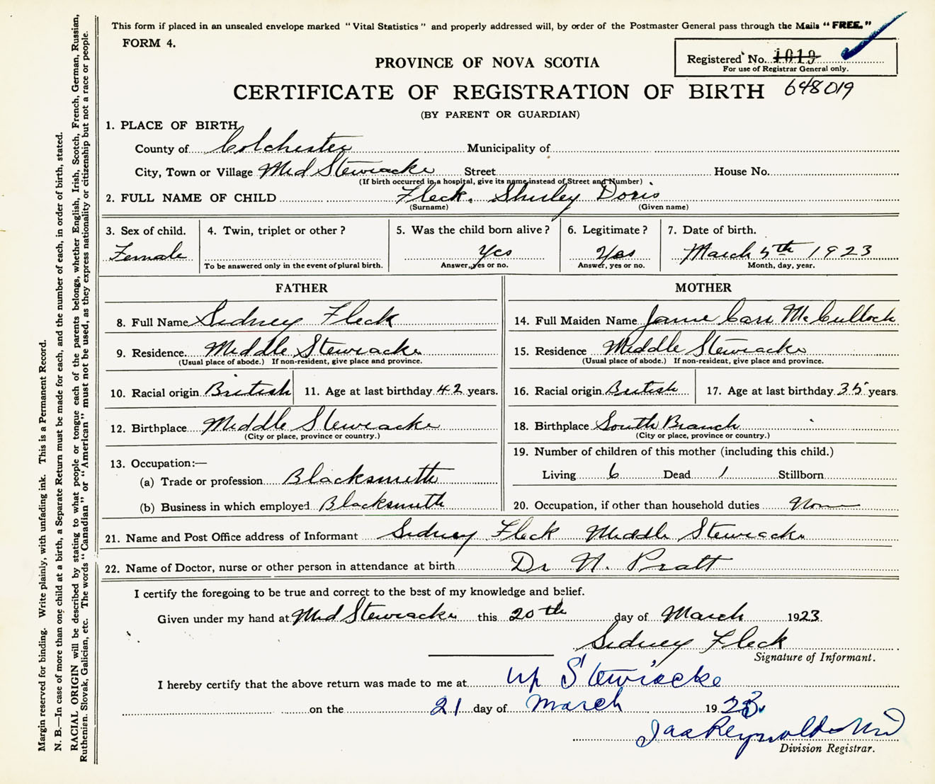Female Birth Registration: Year: 1923 number: 64800019