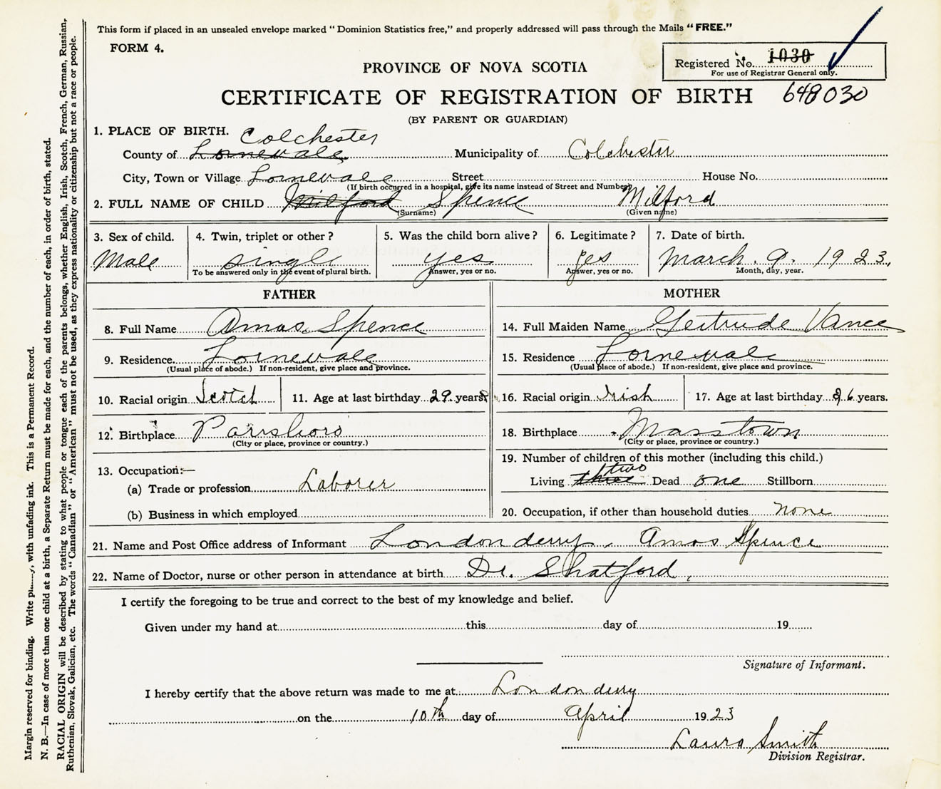 Male Birth Registration: Year: 1923 number: 64800030