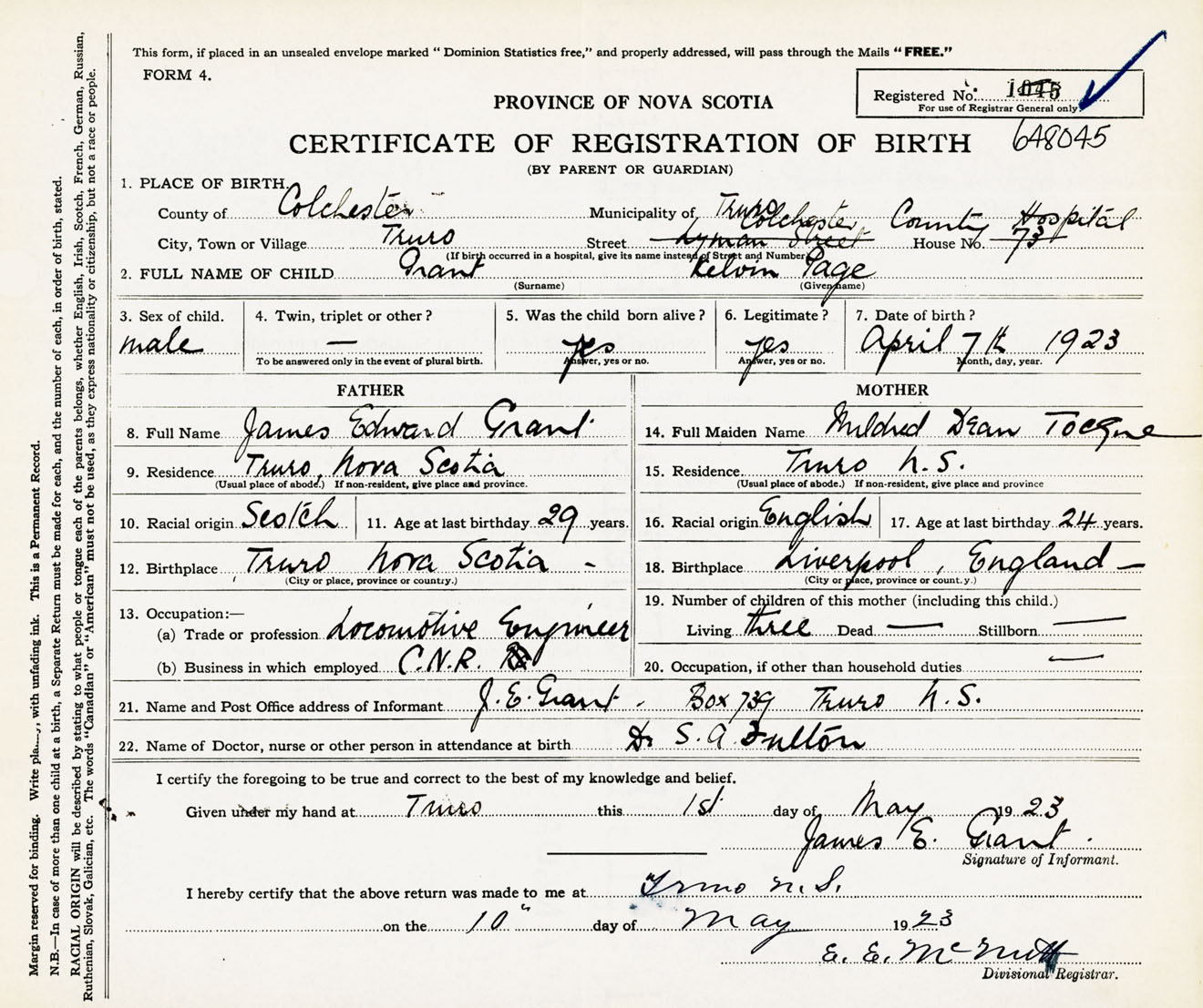 Male Birth Registration: Year: 1923 number: 64800045