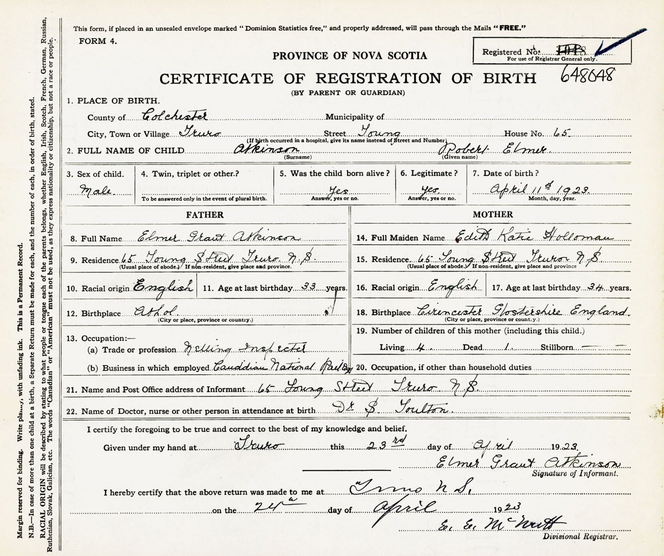 Male Birth Registration: Year: 1923 number: 64800048
