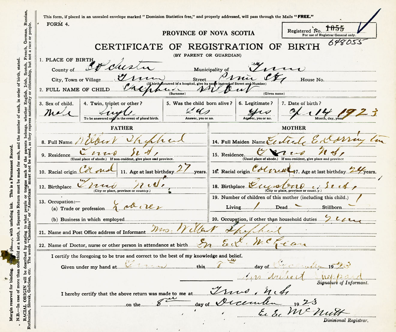 Male Birth Registration: Year: 1923 number: 64800055