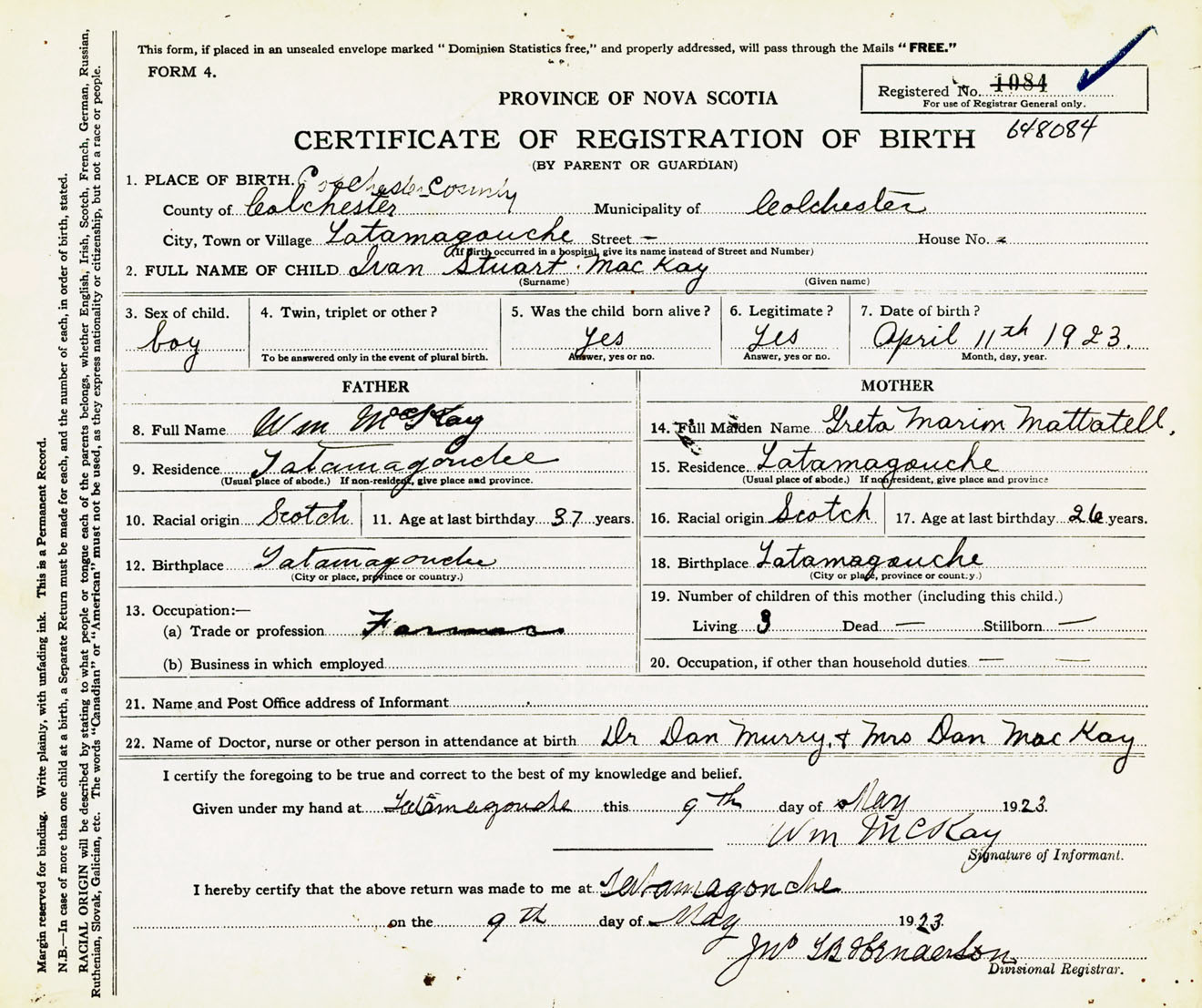 Male Birth Registration: Year: 1923 number: 64800084