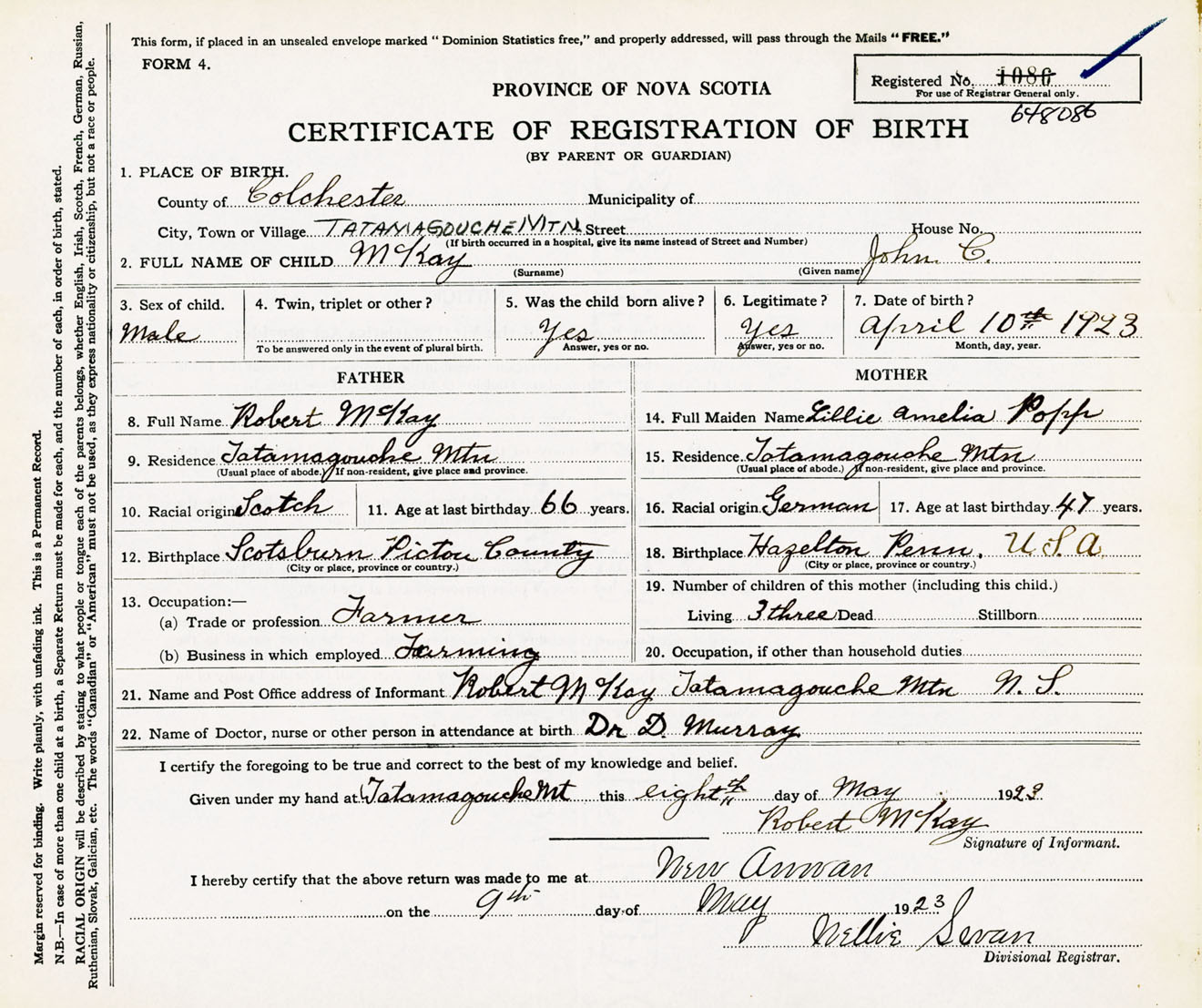 Male Birth Registration: Year: 1923 number: 64800086