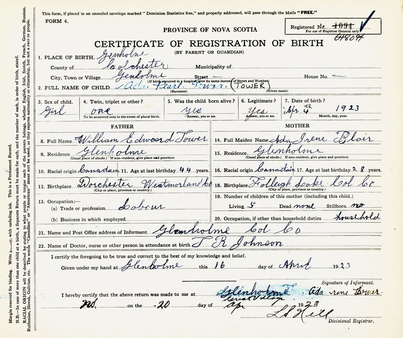 Female Birth Registration: Year: 1923 number: 64800094