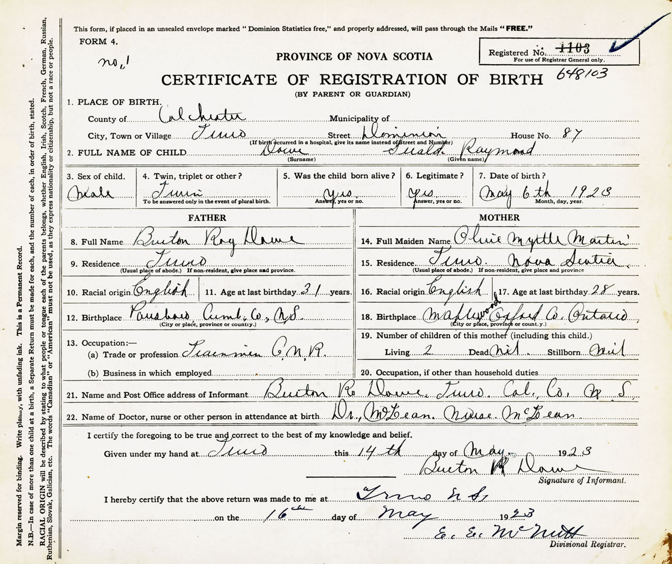 Male Birth Registration: Year: 1923 number: 64800103