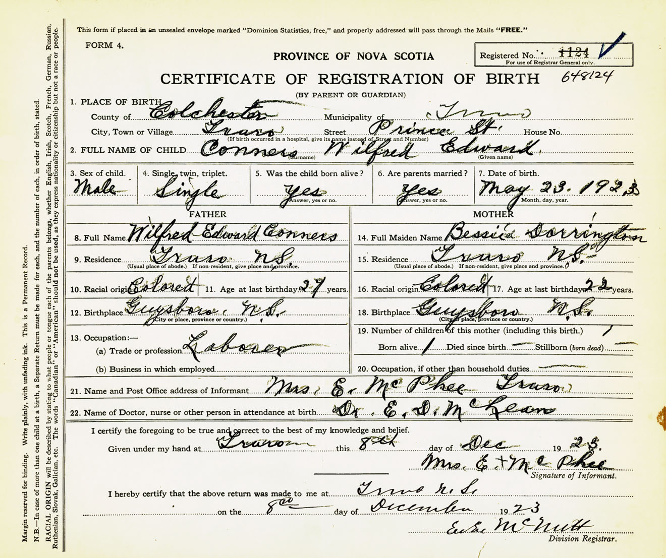 Male Birth Registration: Year: 1923 number: 64800124