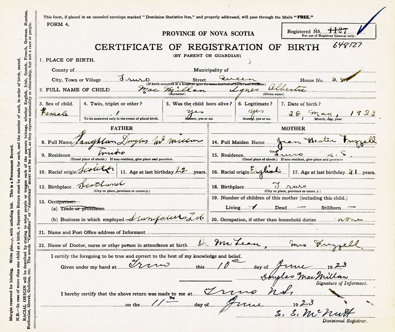 Female Birth Registration: Year: 1923 number: 64800127