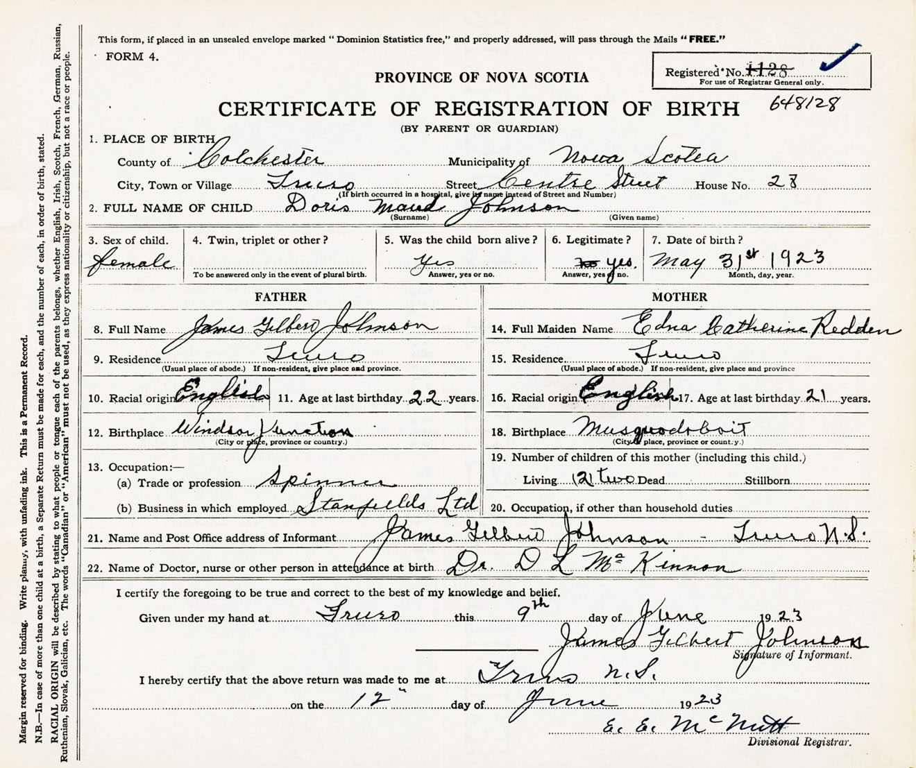 Female Birth Registration: Year: 1923 number: 64800128