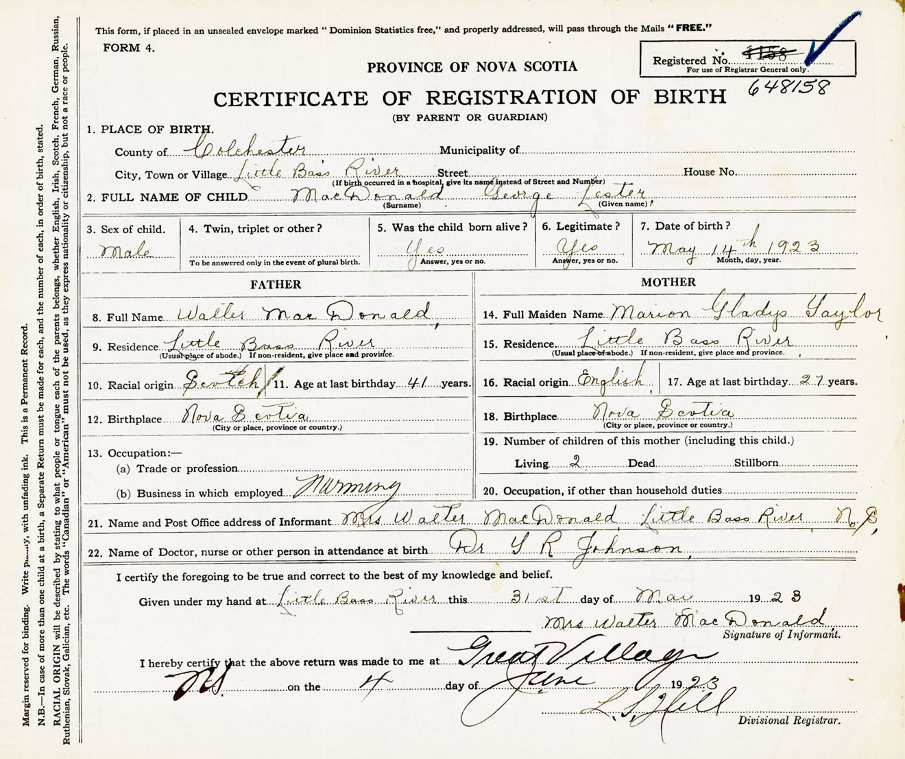 Male Birth Registration: Year: 1923 number: 64800158