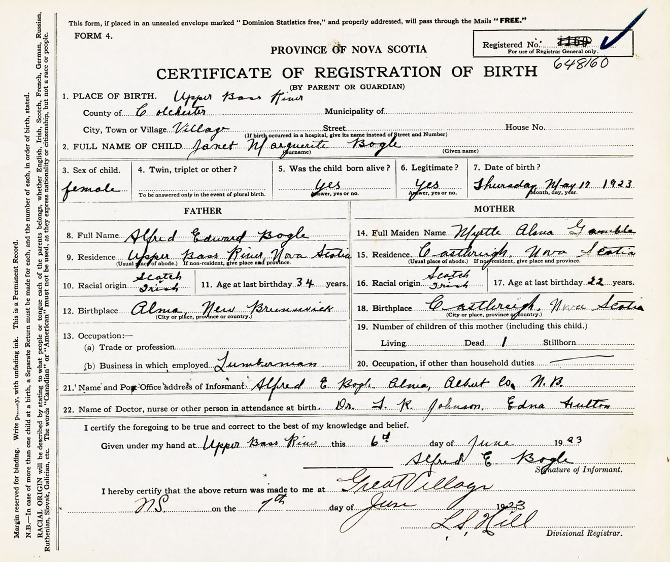 Female Birth Registration: Year: 1923 number: 64800160