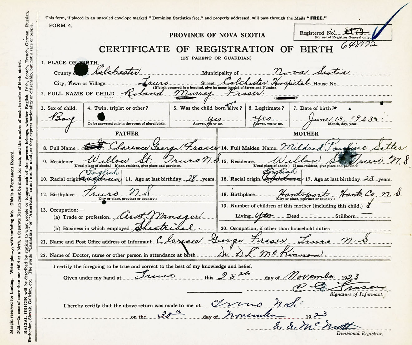 Male Birth Registration: Year: 1923 number: 64800172