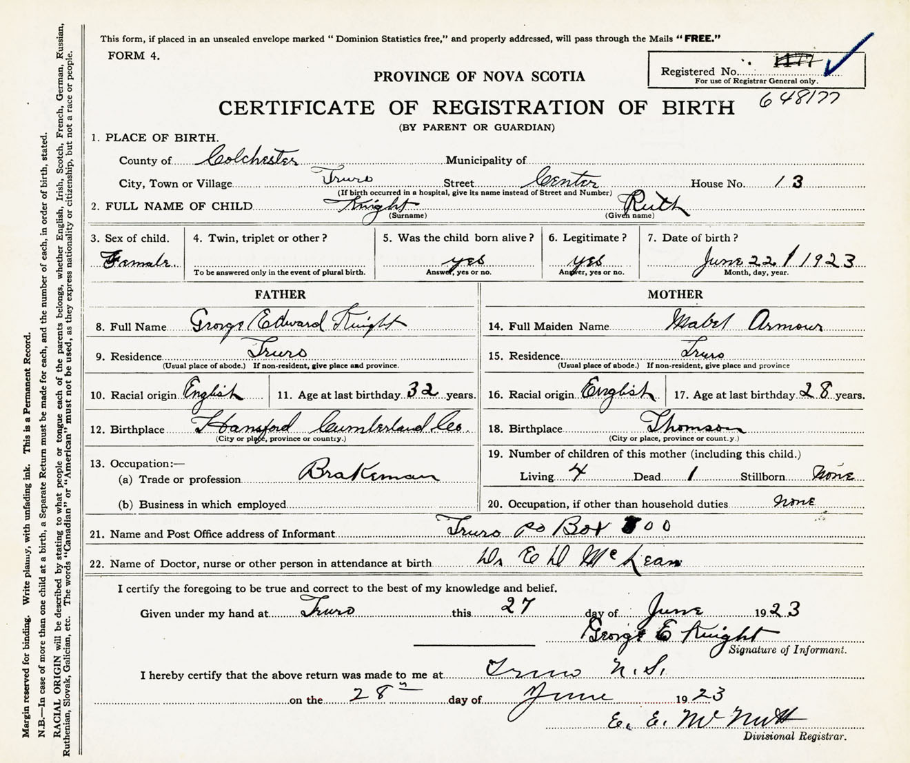 Female Birth Registration: Year: 1923 number: 64800177
